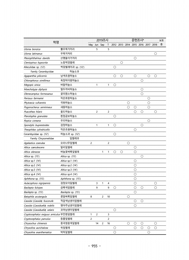 955 학명 2019조사 문헌조사* 보호 May Jun Sep T 2012 2013 2014 2015 2016 2017 2018 종 Uloma bonzica 뿔우묵거저리 5 5 Uloma latimanus 우묵거저리 ? Plesiophthalmus davidis 산맴돌이거저리 ? Cteniopinus hypocrita 노랑썩덩벌레 ? Alleculidae sp. 12‘ 썩덩벌레아과 sp. 12‘ ? Family Cerambycidae 하늘소과 Agapanthia pilicornis 남색초원하늘소 ? ? ? ? ? Chlorophorus simillimus 육점박이범하늘소 ? Megopis sinica 버들하늘소 1 1 ? Moechotypa diphysis 털두꺼비하늘소 ? Olenecamptus formo...