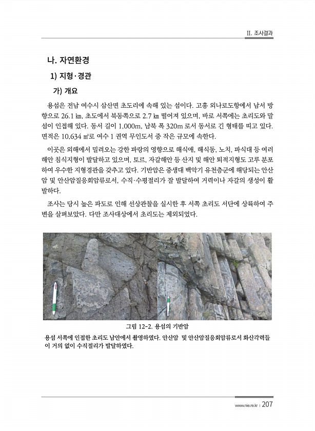 II. 조사결과 www.nie.re.kr ?207 1 · 용섬은 전남 여수시 삼산면 초도리에 속해 있는 섬이다. 고흥 외나로도항에서 남서 방 향으로 26.1 ㎞, 초도에서 북동쪽으로 2.7 ㎞ 떨어져 있으며, 바로 서쪽에는 초리도와 말 섬이 인접해 있다. 동서 길이 1,000m, 남북 폭 320m 로서 동서로 긴 형태를 띠고 있다. 면적은 10,634 ㎡로 여수 1 권역 무인도서 중 작은 규모에 속한다. 이곳은 외해에서 밀려오는 강한 파랑의 영향으로 해식애, 해식동, 노치, 파식대 등 여러 해안 침식지형이 발달하고 있으며, 토르, 자갈해안 등 산지 및 해안 퇴적지형도 고루 분포 하여 우수한 지형경관을 갖추고 있다. 기반암은 중생대 백악기 유천층군에 해당되는 안산 암 및 안산암질응회암류로서, 수직·수평절리가 ...