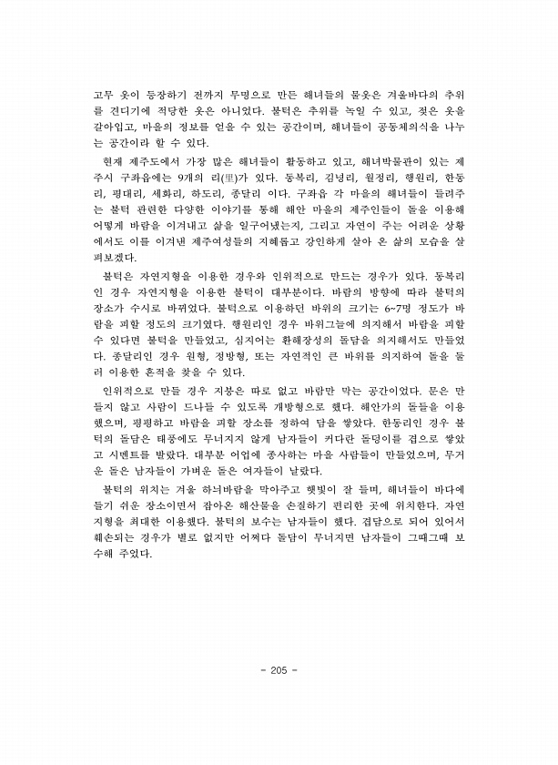 205 고무 옷이 등장하기 전까지 무명으로 만든 해녀들의 물옷은 겨울바다의 추위 를 견디기에 적당한 옷은 아니었다 불턱은 추위를 녹일 수 있고 젖은 옷을 갈아입고 마을의 정보를 얻을 수 있는 공간이며 해녀들이 공동체의식을 나누 는 공간이라 할 수 있다 현재 제주도에서 가장 많은 해녀들이 활동하고 있고 해녀박물관이 있는 제 주시 구좌읍에는 개의 리 가 있다 동복리 김녕리 월정리 행원리 한동 리 평대리 세화리 하도리 종달리 이다 구좌읍 각 마을의 해녀들이 들려주 는 불턱 관련한 다양한 이야기를 통해 해안 마을의 제주인들이 돌을 이용해 어떻게 바람을 이겨내고 삶을 일구어냈는지 그리고 자연이 주는 어려운 상황 에서도 이를 이겨낸 제주여성들의 지혜롭고 강인하게 살아 온 삶의 모습을 살 펴보겠다 불턱은 자연지형을 이용...