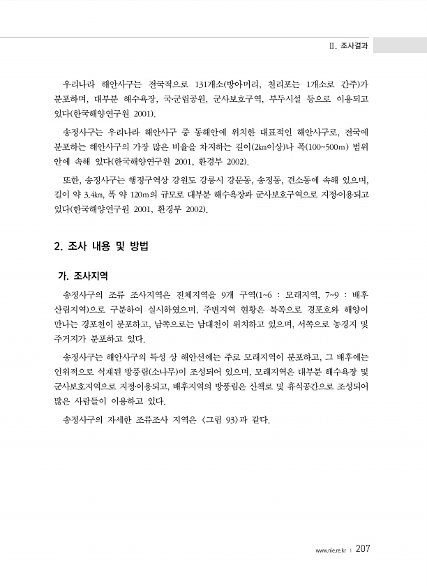 Ⅱ. 조사결과 www.nie.re.kr ? 207 우리나라 해안사구는 전국적으로 131개소 방아머리, 천리포는 1개소로 간주 가 분포하며, 대부분 해수욕장, 국?군립공원, 군사보호구역, 부두시설 등으로 이용되고 있다 한국해양연구원 2001 송정사구는 우리나라 해안사구 중 동해안에 위치한 대표적인 해안사구로, 전국에 분포하는 해안사구의 가장 많은 비율을 차지하는 길이 2㎞이상 나 폭 100500m 범위 안에 속해 있다 한국해양연구원 2001, 환경부 2002 또한, 송정사구는 행정구역상 강원도 강릉시 강문동, 송정동, 견소동에 속해 있으며, 길이 약 3.4㎞, 폭 약 120m의 규모로 대부분 해수욕장과 군사보호구역으로 지정?이용되고 있다 한국해양연구원 2001, 환경부 2002 2. 조사 내용 및 방법 가. ...