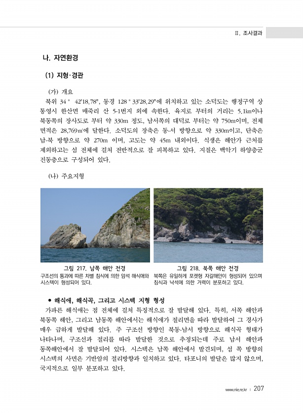 Ⅱ. 조사결과 www.nie.re.kr ? 207 나. 자연환경 1 지형?경관 가 개요 북위 34˚ 4218.78, 동경 128˚3328.29에 위치하고 있는 소덕도는 행정구역 상 통영시 한산면 매죽리 산 5-1번지 외에 속한다. 육지로 부터의 거리는 5.1㎞이나 북동쪽의 장사도로 부터 약 330m 정도, 남서쪽의 대덕로 부터는 약 750m이며, 전체 면적은 28,769㎡에 달한다. 소덕도의 장축은 동-서 방향으로 약 330m이고, 단축은 남-북 방향으로 약 270m 이며, 고도는 약 45m 내외이다. 식생은 해안가 근처를 제외하고는 섬 전체에 걸쳐 전반적으로 잘 피복하고 있다. 지질은 백악기 하양층군 진동층으로 구성되어 있다. 나 주요지형 그림 217. 남쪽 해안 전경 구조선의 통과에 따른 차별 침식에 의...