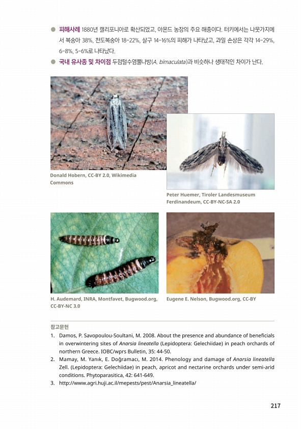 217 참고문헌 1. Damos, P. Savopoulou-Soultani, M. 2008. About the presence and abundance of beneficials in overwintering sites of Anarsia lineatella LepidopteraGelechiidae in peach orchards of northern Greece. IOBC/wprs Bulletin, 3544-50. 2. Mamay, M. Yanık, E. Do?ramacı, M. 2014. Phenology and damage of Anarsia lineatella Zell. LepidopteraGelechiidae in peach, apricot and nectarine orchards under sem...