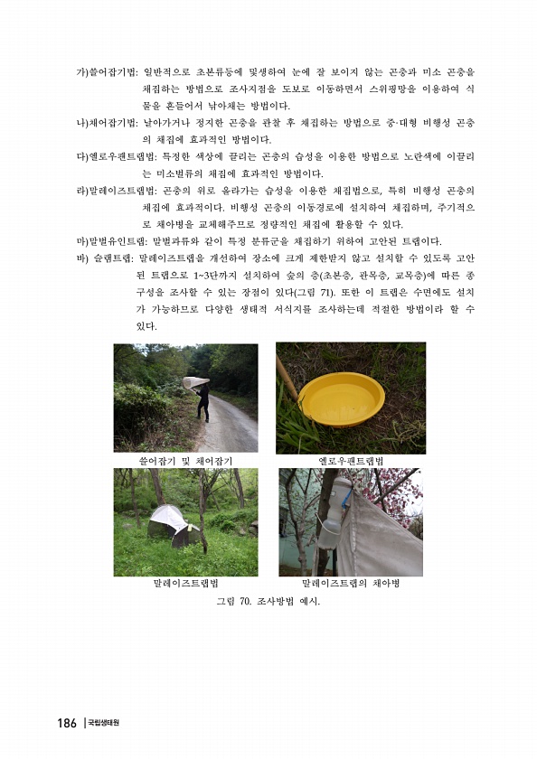 가 쓸어잡기법 일반적으로 초본류등에 및생하여 눈에 잘 보이지 않는 곤충과 미소 곤충을 채집하는 방법으로 조사지점을 도보로 이동하면서 스위핑망을 이용하여 식 물을 흔들어서 낚아채는 방법이다 나 채어잡기법 날아가거나 정지한 곤충을 관찰 후 채집하는 방법으로 중 대형 비행성 곤충 의 채집에 효과적인 방법이다 다 옐로우팬트랩법 특정한 색상에 끌리는 곤충의 습성을 이용한 방법으로 노란색에 이끌리 는 미소벌류의 채집에 효과적인 방법이다 라 말레이즈트랩법 곤충의 위로 올라가는 습성을 이용한 채집법으로 특히 비행성 곤충의 채집에 효과적이다 비행성 곤충의 이동경로에 설치하여 채집하며 주기적으 로 채아병을 교체해주므로 정량적인 채집에 활용할 수 있다 마 말벌유인트랩 말벌과류와 같이 특정 분류군을 채집하기 위하여 고안된 트랩이...