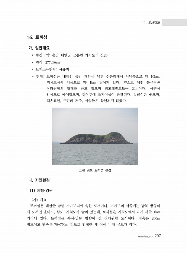 Ⅱ. 조사결과 www.nie.re.kr ? 207 16. 토끼섬 가. 일반개요 ? 행정구역충남 태안군 근흥면 가의도리 산26 ? 면적277,686㎡ ? 토지소유현황사유지 ? 현황토끼섬은 내륙인 충남 태안군 남면 신온리에서 서남쪽으로 약 10km, 지치도에서 서쪽으로 약 1km 떨어져 있다. 옆으로 뉘인 불규칙한 장타원형의 형태를 하고 있으며 최고해발고도는 20m이다. 사면이 암석으로 싸여있으며, 정상부에 초지식생이 관찰된다. 접근성은 좋으며, 훼손요인, 주민의 거주, 시설물은 확인되지 않았다. 그림 260. 토끼섬 전경 나. 자연환경 1 지형?경관 가 개요 토끼섬은 태안군 남면 거아도리에 속한 도서이다. 거아도의 서쪽에는 남북 방향의 세 도서인 울미도, 삼도, 지치도가 놓여 있는데, 토끼섬은 지치도에서 다시...