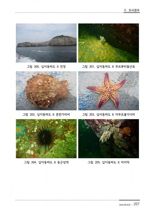 Ⅱ. 조사결과 www.nie.re.kr ? 207 그림 200. 십이동파도 6 전경 그림 201. 십이동파도 6 무쓰뿌리돌산호 그림 202. 십이동파도 6 흔한가리비 그림 203. 십이동파도 6 아무르불가사리 그림 204. 십이동파도 6 둥근성게 그림 205. 십이동파도 6미더덕