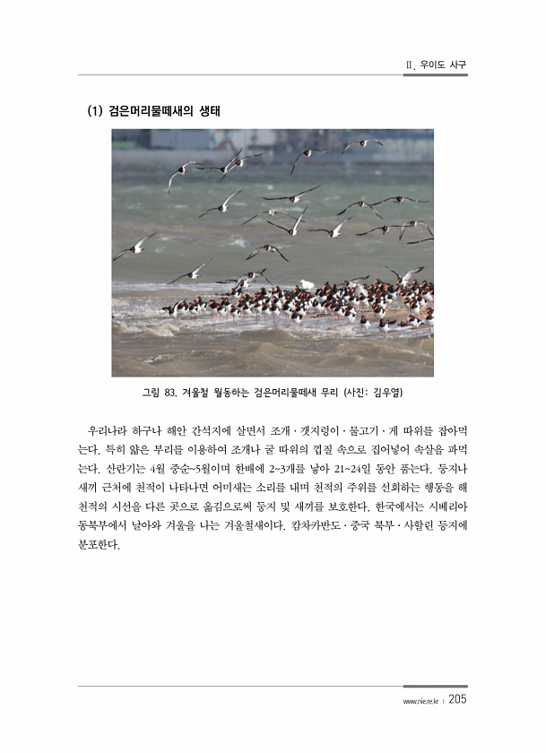 Ⅱ. 우이도 사구 www.nie.re.kr ? 205 1 검은머리물떼새의 생태 그림 83. 겨울철 월동하는 검은머리물떼새 무리 사진김우열 우리나라 하구나 해안 간석지에 살면서 조개·갯지렁이·물고기·게 따위를 잡아먹 는다. 특히 얇은 부리를 이용하여 조개나 굴 따위의 껍질 속으로 집어넣어 속살을 파먹 는다. 산란기는 4월 중순5월이며 한배에 23개를 낳아 2124일 동안 품는다. 둥지나 새끼 근처에 천적이 나타나면 어미새는 소리를 내며 천적의 주위를 선회하는 행동을 해 천적의 시선을 다른 곳으로 옮김으로써 둥지 및 새끼를 보호한다. 한국에서는 시베리아 동북부에서 날아와 겨울을 나는 겨울철새이다. 캄차카반도·중국 북부·사할린 등지에분포한다.