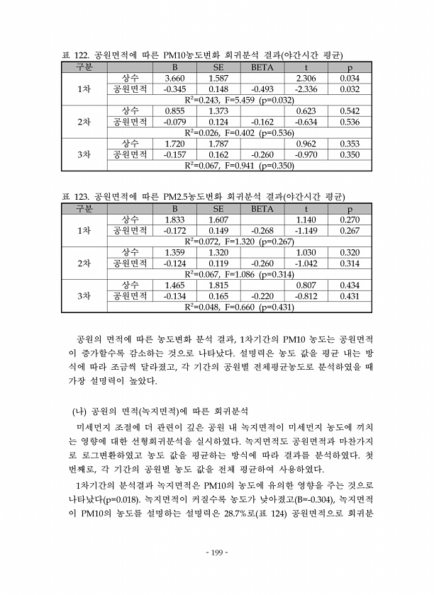 199 구분 차 상수 공원면적 차 상수 공원면적 차 상수 공원면적 표 공원면적에 따른 농도변화 회귀분석 결과 야간시간 평균 구분 차 상수 공원면적 차 상수 공원면적 차 상수 공원면적 표 공원면적에 따른 농도변화 회귀분석 결과 야간시간 평균 공원의 면적에 따른 농도변화 분석 결과 차기간의 농도는 공원면적 이 증가할수록 감소하는 것으로 나타났다 설명력은 농도 값을 평균 내는 방 식에 따라 조금씩 달라졌고 각 기간의 공원별 전체평균농도로 분석하였을 때 가장 설명력이 높았다 나 공원의 면적 녹지면적 에 따른 회귀분석 미세먼지 조절에 더 관련이 깊은 공원 내 녹지면적이 미세먼지 농도에 끼치 는 영향에 대한 선형회귀분석을 실시하였다 녹지면적도 공원면적과 마찬가지 로 로그변환하였고 농도 값을 평균하는 방식에 따라 결과를...