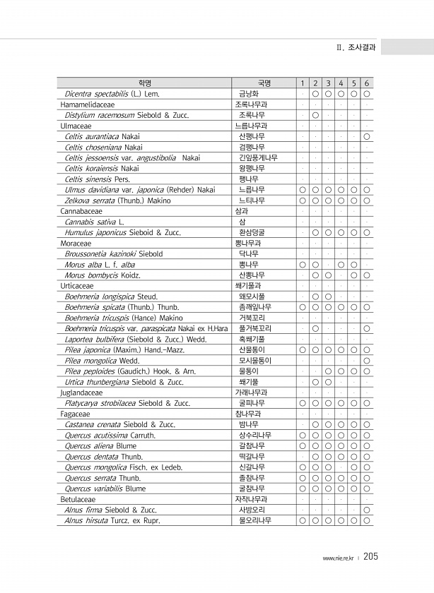 Ⅱ. 조사결과 www.nie.re.kr ? 205 학명 국명 1 2 3 4 5 6 Dicentra spectabilis L. Lem. 금낭화 ○ ○ ○ ○ ○ Hamamelidaceae 조록나무과 Distylium racemosum Siebold & Zucc. 조록나무 ○ Ulmaceae 느릅나무과 Celtis aurantiaca Nakai 산팽나무 ○ Celtis choseniana Nakai 검팽나무 Celtis jessoensis var. angustibolia Nakai 긴잎풍게나무 Celtis koraiensis Nakai 왕팽나무 Celtis sinen...