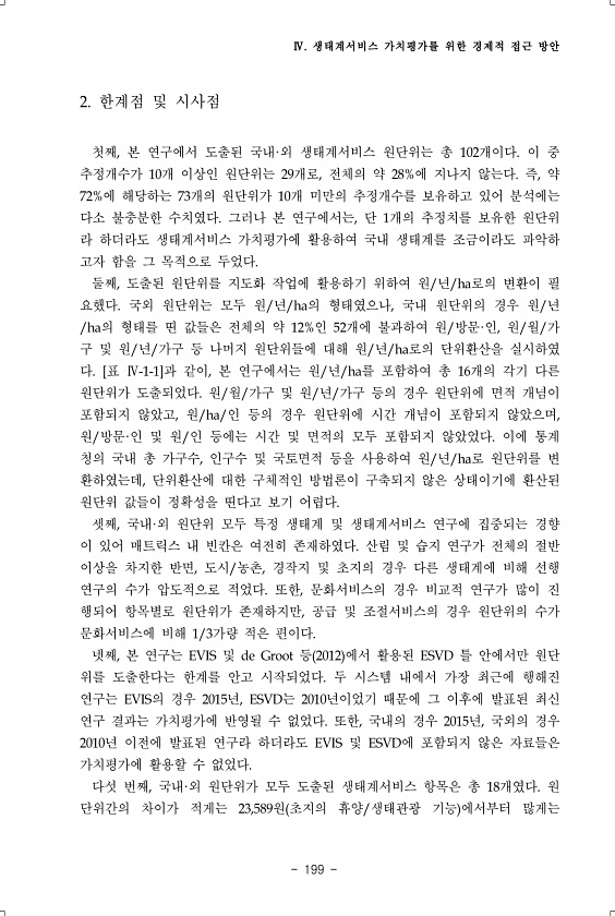 Ⅳ. 생태계서비스 가치평가를 위한 경제적 접근 방안 199 2. 한계점 및 시사점 첫째, 본 연구에서 도출된 국내·외 생태계서비스 원단위는 총 102개이다. 이 중 추정개수가 10개 이상인 원단위는 29개로, 전체의 약 28%에 지나지 않는다. 즉, 약 72%에 해당하는 73개의 원단위가 10개 미만의 추정개수를 보유하고 있어 분석에는 다소 불충분한 수치였다. 그러나 본 연구에서는, 단 1개의 추정치를 보유한 원단위 라 하더라도 생태계서비스 가치평가에 활용하여 국내 생태계를 조금이라도 파악하 고자 함을 그 목적으로 두었다. 둘째, 도출된 원단위를 지도화 작업에 활용하기 위하여 원/년/ha로의 변환이 필 요했다. 국외 원단위는 모두 원/년/ha의 형태였으나, 국내 원단위의 경우 원/년 /ha의 형태를 띤 값들...