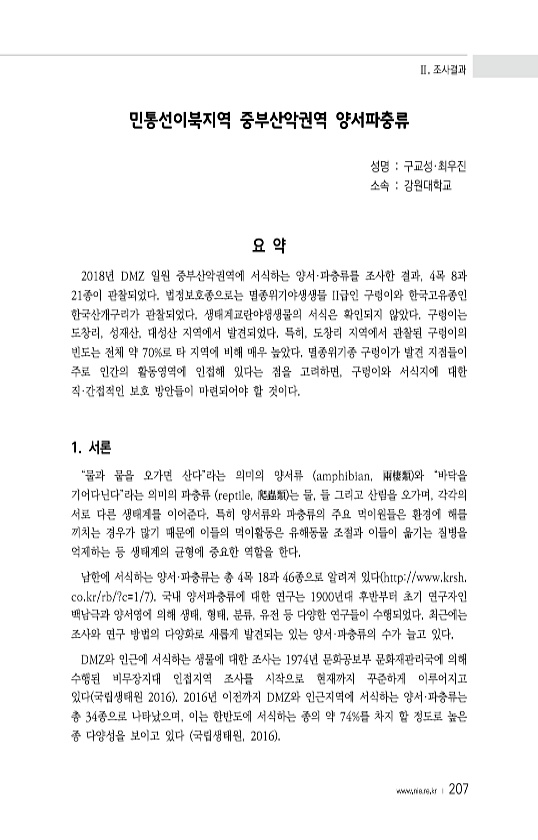 Ⅱ. 조사결과 www.nie.re.kr ? 207 민통선이북지역 중부산악권역 양서파충류 성명 구교성·최우진 소속 강원대학교 요 약 2018년 DMZ 일원 중부산악권역에 서식하는 양서·파충류를 조사한 결과, 4목 8과 21종이 관찰되었다. 법정보호종으로는 멸종위기야생생물 II급인 구렁이와 한국고유종인 한국산개구리가 관찰되었다. 생태계교란야생생물의 서식은 확인되지 않았다. 구렁이는 도창리, 성재산, 대성산 지역에서 발견되었다. 특히, 도창리 지역에서 관찰된 구렁이의 빈도는 전체 약 70%로 타 지역에 비해 매우 높았다. 멸종위기종 구렁이가 발견 지점들이 주로 인간의 활동영역에 인접해 있다는 점을 고려하면, 구렁이와 서식지에 대한 직·간접적인 보호 방안들이 마련되어야 할 것이다. 1. 서론 “물과 뭍을 오가면 산...