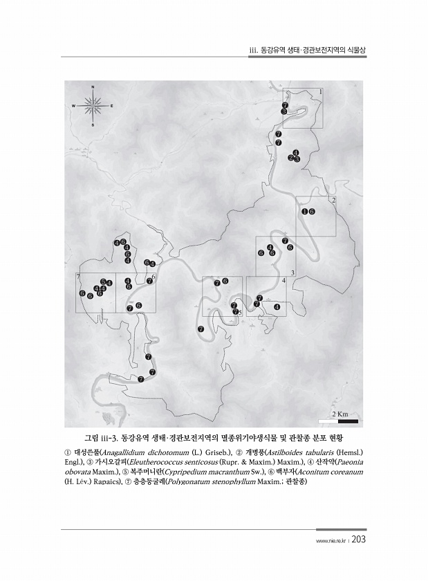 iii. 동강유역 생태·경관보전지역의 식물상 www.nie.re.kr ?203 그림 iii-3. 동강유역 생태·경관보전지역의 멸종위기야생식물 및 관찰종 분포 현황 ① 대성쓴풀 Anagallidium dichotomum L. Griseb. , ② 개병풍 Astilboides tabularis Hemsl. Engl. , ③ 가시오갈피 Eleutherococcus senticosus Rupr. & Maxim. Maxim. , ④ 산작약 Paeonia obovata Maxim. , ⑤ 복주머니란 Cypripedium macranthum Sw. , ⑥ 백부자 Aconitum coreanum H. L?v. Rapaics , ⑦ 층층둥굴레 Polygonatum stenophyllum Maxim.; 관찰종