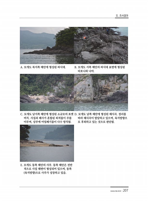 II. 조사결과 www.nie.re.kr ?207 A. 모개도 북서쪽 해안에 형성된 파식대. B. 모개도 서쪽 해안의 파식대 표면에 형성된 타포니와 나마. C. 모개도 남서쪽 해안에 형성된 소규모의 포켓 비치. 사질과 패사가 혼합된 퇴적물이 주를 이루며, 상부에 어업폐기물이 다수 방치됨. D. 모개도 남쪽 해안에 형성된 해식곡. 절리를 따라 해식곡이 발달하고 있으며, 육지방향으 로 후퇴하고 있는 것으로 판단됨. E. 모개도 동쪽 해안의 사주. 동쪽 해안은 전반 적으로 사질 해변이 형성되어 있으며, 동쪽 육지방향 으로 사주가 성장하고있음.