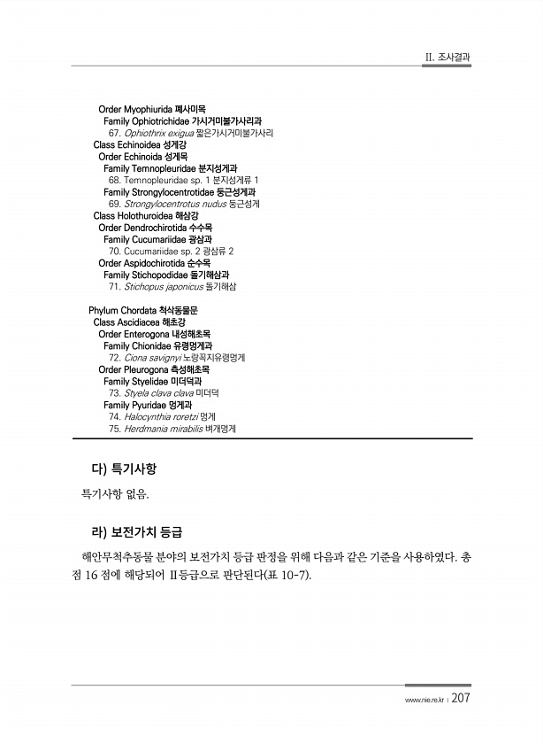 II. 조사결과 www.nie.re.kr ?207 특기사항 없음. 해안무척추동물 분야의 보전가치 등급 판정을 위해 다음과 같은 기준을 사용하였다. 총 점 16 점에 해당되어 Ⅱ등급으로 판단된다 표 10-7 Order Myophiurida 폐사미목 Family Ophiotrichidae 가시거미불가사리과 67. Ophiothrix exigua 짧은가시거미불가사리 Class Echinoidea 성게강 Order Echinoida 성게목 Family Temnopleuridae 분지성게과 68. Temnopleuridae sp. 1 분지성게류 1 Family Strongylocentrotidae 둥근성게과 69. Strongylocentrotus nudus 둥근성게 Class Holothuroidea 해삼강 Ord...