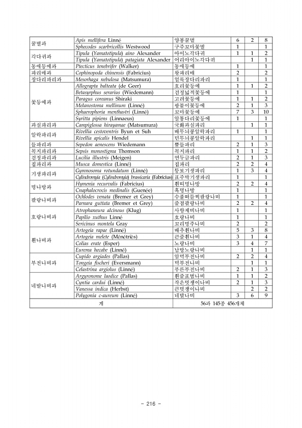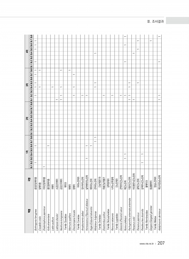 www ·nie·re·kr ? 207 학명 국명 1차 2차 3차 4차 St.1 St.2 St.3 St.4 St.5 St.6 St.7 St.8 St.1 St.2 St.3 St.4 St.5 St.6 St.7 St.8 St.1 St.2 St.3 St.4 St.5 St.6 St.7 St.8 St.1 St.2 St.3 St.4 St.5 St.6 St.7 St.8 Bothrogonia ferruginea 끝검은말매미충 1 1 1 1 1 1 1 1 1 1 1 Cicadella viridis 말매미충 1 1 Diodontophorus japonicus 지리산말매미충 1 Kolla atramentaria 줄친말매미충 1 Ledra auditura 귀매미 1 Ledropsis discolor 소금강귀매미 1 Neotituri...