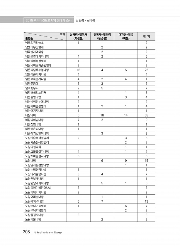 2018 백두대간보호지역 생태계 조사 삽당령 신배령 208 ? National Institute of Ecology 구간 출현종 삽당령닭목재 화란봉 닭목재대관령 능경봉 대관령매봉 매봉 합 계 남색초원하늘소 1 1 2 남생이무당벌레 2 2 남쪽날개매미충 2 2 넉점물결애기자나방 4 2 6 넉점박이송장벌레 1 1 넉점박이큰가슴잎벌레 2 2 넓은띠담흑수염나방 16 4 5 25 넓은띠큰가지나방 4 4 넓은뾰족날개나방 4 2 4 1 넓적꽃등에 3 3 6 넓적꽃무지 2 5 7 넓적배허리노린재 4 1 5 네눈들명나방 1 3 4 네눈박이산누에나방 2 2 네눈박이송장벌레 1 2 1 4 네눈애기자나방 1 1 네발나비 6 18 14 38 네점박이밤나방 7 2 9 네점집명나방 1 1 네줄붉은밤나방 1 1 네줄애기잎말이나방 3 3...