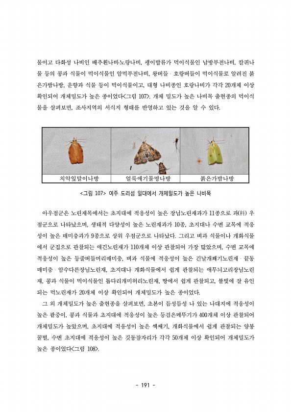 191 물이고 다화성 나비인 배추흰나비노랑나비 괭이밥류가 먹이식물인 남방부전나비 칼퀴나 ? , , 물 등의 콩과 식물이 먹이식물인 암먹부전나비 왕버들 호랑버들이 먹이식물로 알려진 붉 , ? 은가밤나방 운향과 식물 등이 먹이식물이고 대형 나비종인 호랑나비가 각각 개체 이상 , , 20 확인되어 개체밀도가 높은 종이었다 그림 개체 밀도가 높은 나비목 출현종의 먹이식 107 물을 살펴보면 조사지역의 서식지 형태를 반영하고 있는 것을 알 수 있다 , 치악잎말이나방 얼룩애기물명나방 붉은가밤나방 그림 107 여주 도리섬 일대에서 개체밀도가 높은 나비목 아우점군은 노린재목에서는 초지대에 적응성이 높은 장님노린재과가 종으로 과 우 11 科 점군으로 나타났으며 생태적 다양성이 높은 노린재과가 종 초지대나 수변 교목에 적응 ...