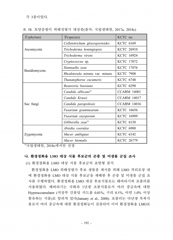 192 3 LMO 1 LMO LMO LMO LMO LMO 1 Hyperaccumulator 0.01%, 0.1%, 1.0% January et al., 2008 LMO phylum species KCTC no. Ascomycota Colletotrichum gloeosporioides KCTC 6169 Trichoderma koningiopsis KCTC 26910 Trichoderma virens KCTC 16924 Basidiomycota Cryptococcus sp. KCTC 17072 Hannaella zeae KCTC 17076 Rhodotorula minuta var. minuta KCTC 7908 Thanatephorus cucumeris KCTC 6748 Sac fungi Beauveria b...