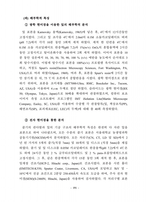 191 ① Karnovsky Karnovsky, 1965 , 4 12 4 2.0ml 0.1M pH 7.2 10 3 4 0.1M pH 7.2 1% w/v OsO4 2 2 10 10, 30, 50, 70, 90, 100 % v/v 3 100% v/v , Spurrs resin Electron Microscopy Sciences, Fort Washington, PA, USA Spurr, 1969 , Spurrs resin 2 , 75 , MT7000-Ultra; RMC, Boeckeler Inc., Tucson, AZ, USA 4 m BX 50; Olympus, Tokyo, Japan 50 , IMT iSolution Lite Martin Microscope Company, Easley, SC, USA , PP ...