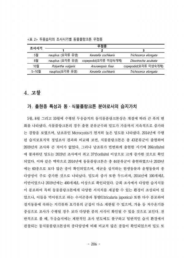206 조사시기 우점종 1 2 3 5월 nauplius 요각류 유생 Keratella cochlearis Trichocerca elongata 8월 nauplius 요각류 유생 copepodid 요각류 미성숙개체 Dissotrocha aculeata 10월 Polyartha vulgaris Anuraeopsis fissa copepodid 요각류 미성숙개체 510월 nauplius 요각류 유생 Keratella cochlearis Trichocerca elongata 표 2 두웅습지의 조사시기별 동물플랑크톤 우점종 4. 고찰 가. 출현종 특성과 동?식물플랑크톤 분야로서의 습지가치 5월, 8월 그리고 10월에 수행된 두웅습지의 동식물플랑크톤상은 계절에 따라 큰 폭의 변 화를 나타냈다. 식물플랑크톤의 경우 출현...