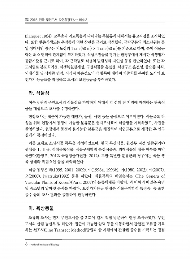 2018 전국 무인도서 자연환경조사 여수 3 8 ? National Institute of Ecology Blanquet 1964 , 교목층과 아교목층에 나타나는 목본류에 대해서는 흉고직경을 조사하였 다. 또한 현존식생도는 우점종에 의한 상관을 근거로 작성했다. 군락구분의 최소단위는 동 일 생태계인 경우는 지도상의 1 cm 50 m × 1 cm 50 m 를 기준으로 하며, 특이 식물군 락은 최소 면적에 관계없이 표기하였다. 식생보전등급 평가는 환경부에서 제시한 식생평가 등급기준을 근거로 하여, 각 군락별로 식생의 발달성과 자연성 등을 판단하였다. 또한 각 도서별로 분포희귀성, 식생복원잠재성, 구성식물종 온전성, 식생구조 온전성, 중요종 서식, 외래식물 및 식재종 면적, 서식지 훼손정도의 각 항목에 대하여 가...