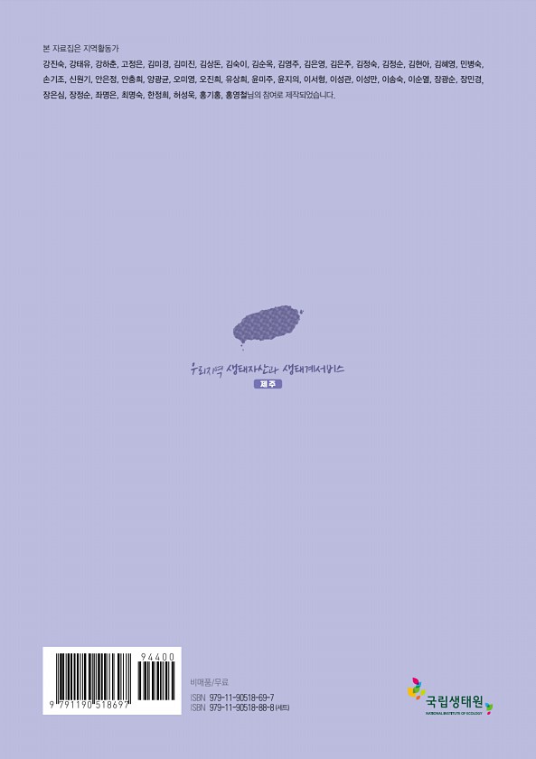 제 주 우리지역생태자산과 생태계서비스 비매품/무료 ISBN ISBN 979-11-90518-69-7 979-11-90518-88-8 세트 본 자료집은 지역활동가 강진숙, 강태유, 강하춘, 고정은, 김미경, 김미진, 김상돈, 김숙이, 김순옥, 김영주, 김은영, 김은주, 김정숙, 김정순, 김현아, 김혜영, 민병숙, 손기조, 신원기, 안은정, 안충희, 양광균, 오미영, 오진희, 유상희, 윤미주, 윤지의, 이서형, 이성관, 이성만, 이송숙, 이순열, 장광순, 장민경, 장은심, 장정순, 좌명은, 최명숙, 한정희, 허성욱, 홍기홍, 홍영철님의 참여로제작되었습니다.