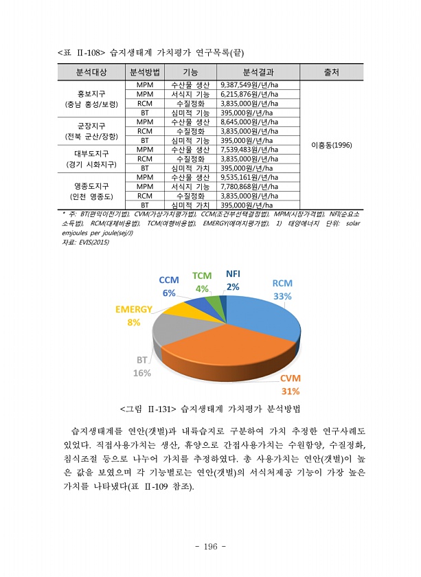196 분석대상 분석방법 기능 분석결과 출처 홍보지구 충남 홍성/보령 MPM 수산물 생산 9,387,549원/년/ha 이흥동 1996 MPM 서식지 기능 6,215,876원/년/ha RCM 수질정화 3,835,000원/년/ha BT 심미적 기능 395,000원/년/ha 군장지구 전북 군산/장항 MPM 수산물 생산 8,645,000원/년/ha RCM 수질정화 3,835,000원/년/ha BT 심미적 기능 395,000원/년/ha 대부도지구 경기 시화지구 MPM 수산물 생산 7,539,483원/년/ha RCM 수질정화 3,835,000원/년/ha BT 심미적 가치 395,000원/년/ha 영종도지구 인천 영종도 MPM 수산물 생산 9,535,161원/년/ha MPM 서식지 기능 7,780,868원/년/ha RC...