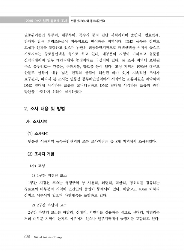 2015 DMZ 일원 생태계 조사 민통선이북지역 동부해안권역 208 ? National Institute of Ecology 멸종위기종인 두루미, 재두루미, 독수리 등의 집단 서식지이며 호반새, 청호반새, 참매와 같은 희귀조류들이 지속적으로 번식하는 지역이다. DMZ 동부는 강원도 고성과 인제를 포함하고 있으며 남한의 최동북단지역으로 태백산맥을 서에서 동으로 가로지르는 향로봉산맥을 축으로 하고 있다. 대부분의 지형이 가파르고 험준한 산악지대이며 일부 해안지대와 농경지대로 구성되어 있다. 본 조사 지역에 포함된 주요 봉우리로는 건봉산, 큰까치봉, 향로봉 등이 있다. 고성 지역은 1996년 대규모 산불로 인하여 매우 넓은 면적의 산림이 훼손된 바가 있어 지속적인 조사가 요구된다. 따라서 본 조사는 민통선 동부해...