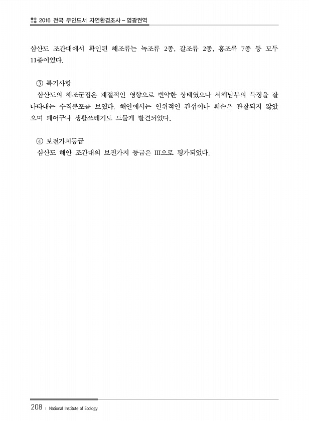 2016 전국 무인도서 자연환경조사 영광권역 208 ? National Institute of Ecology 삼산도 조간대에서 확인된 해조류는 녹조류 2종, 갈조류 2종, 홍조류 7종 등 모두 11종이었다. ③ 특기사항 삼산도의 해조군집은 계절적인 영향으로 빈약한 상태였으나 서해남부의 특징을 잘 나타내는 수직분포를 보였다. 해안에서는 인위적인 간섭이나 훼손은 관찰되지 않았 으며 폐어구나 생활쓰레기도 드물게 발견되었다. ④ 보전가치등급 삼산도 해안 조간대의 보전가지 등급은 III으로평가되었다.
