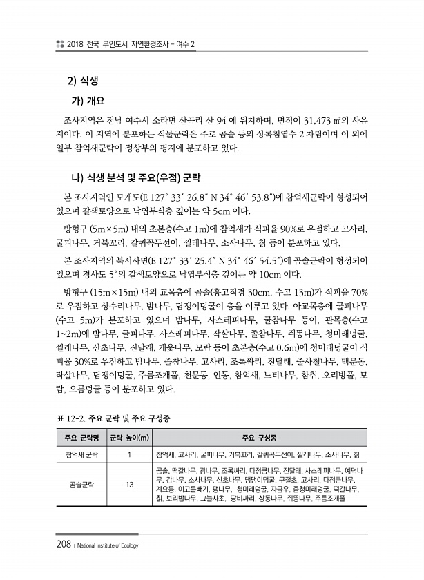 2018 전국 무인도서 자연환경조사 여수 2 208 ? National Institute of Ecology 2 조사지역은 전남 여수시 소라면 산곡리 산 94 에 위치하며, 면적이 31,473 ㎡의 사유 지이다. 이 지역에 분포하는 식물군락은 주로 곰솔 등의 상록침엽수 2 차림이며 이 외에 일부 참억새군락이 정상부의 평지에 분포하고 있다. 본 조사지역인 모개도 E 127° 33′ 26.8″ N 34° 46′ 53.8″ 에 참억새군락이 형성되어 있으며 갈색토양으로 낙엽부식층 깊이는 약 5cm 이다. 방형구 5m×5m 내의 초본층 수고 1m 에 참억새가 식피율 90%로 우점하고 고사리, 굴피나무, 거북꼬리, 갈퀴꼭두선이, 찔레나무, 소사나무, 칡 등이 분포하고 있다. 본 조사지역의 북서사면 E 127° 33′ ...