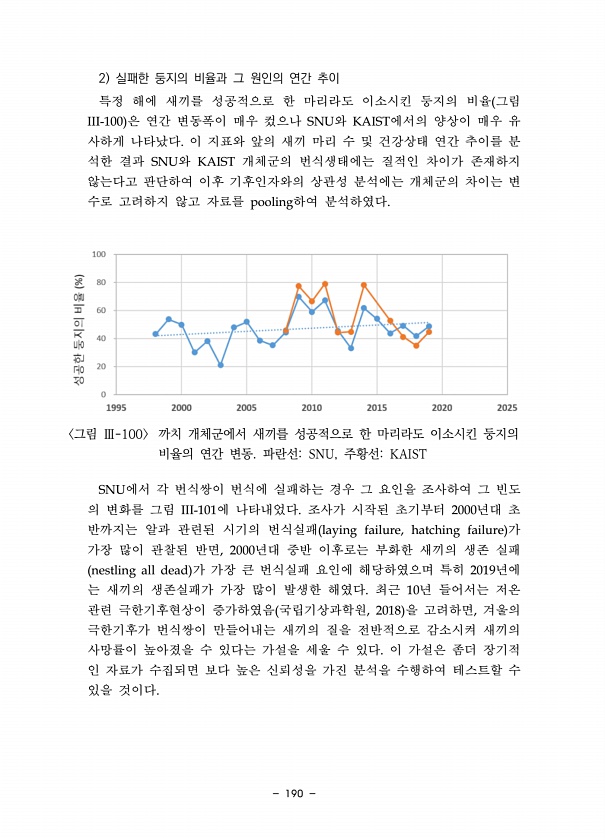 190 2 실패한 둥지의 비율과 그 원인의 연간 추이 특정 해에 새끼를 성공적으로 한 마리라도 이소시킨 둥지의 비율 그림 III-100 은 연간 변동폭이 매우 컸으나 SNU와 KAIST에서의 양상이 매우 유 사하게 나타났다. 이 지표와 앞의 새끼 마리 수 및 건강상태 연간 추이를 분 석한 결과 SNU와 KAIST 개체군의 번식생태에는 질적인 차이가 존재하지 않는다고 판단하여 이후 기후인자와의 상관성 분석에는 개체군의 차이는 변 수로 고려하지 않고 자료를 pooling하여 분석하였다. SNU에서 각 번식쌍이 번식에 실패하는 경우 그 요인을 조사하여 그 빈도 의 변화를 그림 III-101에 나타내었다. 조사가 시작된 초기부터 2000년대 초 반까지는 알과 관련된 시기의 번식실패 laying failure, ha...