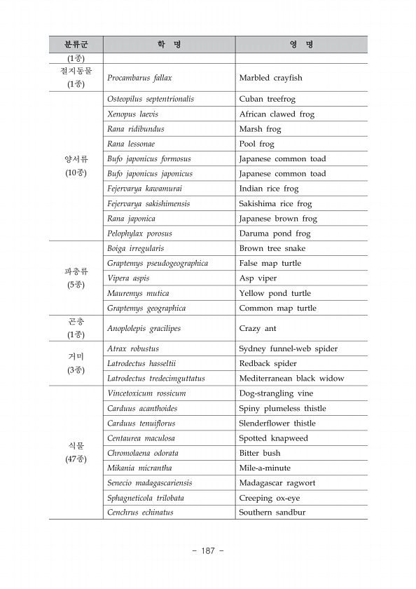 1 1 Procambarus fallax Marbled crayfish 10 Osteopilus septentrionalis Cuban treefrog Xenopus laevis African clawed frog Rana ridibundus Marsh frog Rana lessonae Pool frog Bufo japonicus formosus Japanese common toad Bufo japonicus japonicus Japanese common toad Fejervarya kawamurai Indian rice frog Fejervarya sakishimensis Sakishima rice frog Rana japonica Japanese brown frog Pelophylax porosus Da...