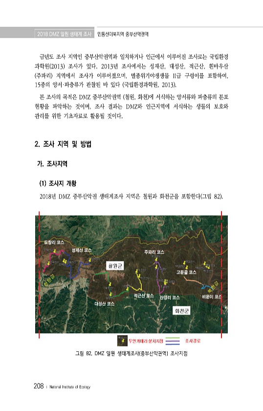 2018 DMZ 일원 생태계 조사 민통선이북지역 중부산악권역 208 ? National Institute of Ecology 금년도 조사 지역인 중부산악권역과 일치하거나 인근에서 이루어진 조사로는 국립환경 과학원 2013 조사가 있다. 2013년 조사에서는 성재산, 대성산, 적근산, 흰바우산 주파리 지역에서 조사가 이루어졌으며, 멸종위기야생생물 II급 구렁이를 포함하여, 15종의 양서·파충류가 관찰된 바 있다 국립환경과학원, 2013 본 조사의 목적은 DMZ 중부산악권역 철원, 화천 에 서식하는 양서류와 파충류의 분포 현황을 파악하는 것이며, 조사 결과는 DMZ와 인근지역에 서식하는 생물의 보호와 관리를 위한 기초자료로 활용될 것이다. 2. 조사 지역 및 방법 가. 조사지역 1 조사지 개황 2018년 DMZ...