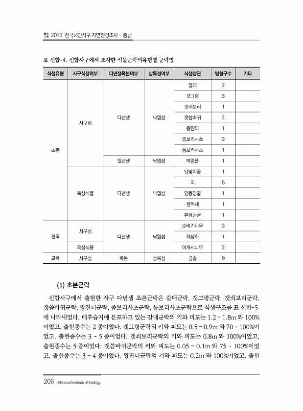 2018 전국해안사구 자연환경조사 충남 206 ? National Institute of Ecology 식생유형 사구식생여부 다년생목본여부 상록성여부 식생상관 방형구수 기타 초본 사구성 다년생 낙엽성 갈대 2 갯그령 3 갯쇠보리 1 갯씀바귀 2 왕잔디 1 좀보리사초 3 통보리사초 1 일년생 낙엽성 백령풀 1 육상식물 다년생 낙엽성 달맞이꽃 1 띠 5 인동덩굴 1 참억새 1 환삼덩굴 1 관목 사구성 다년생 낙엽성 순비기나무 3 해당화 1 육상식물 아까시나무 2 교목 사구성 목본 상록성 곰솔 9 표 신합-4. 신합사구에서 조사한 식물군락의유형별 군락명 1 신합사구에서 출현한 사구 다년생 초본군락은 갈대군락, 갯그령군락, 갯쇠보리군락, 갯씀바귀군락, 왕잔디군락, 좀보리사초군락, 통보리사초군락으로 식생구조를 표 신...
