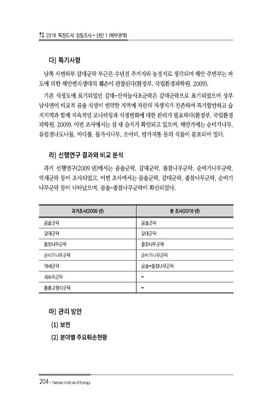 2018 특정도서 정밀조사 신안 1 북부권역 204 ? National Institute of Ecology 남쪽 사면하부 갈대군락 부근은 수년전 주거지와 농경지로 생각되며 해안 주변부는 파 도에 의한 해안변식생대의 훼손이 관찰된다 환경부. 국립환경과학원. 2009 기존 식생도에 표기되었던 갈대-산비늘사초군락은 갈대군락으로 표기되었으며 상부 남사면이 비교적 곰솔 식생이 빈약한 지역에 자란의 자생지가 잔존하여 특기할만하고 습 지지역과 함께 지속적인 모니터링과 식생변화에 대한 관리가 필요하다 환경부. 국립환경 과학원. 2009 이번 조사에서는 섬 내 습지가 확인되고 있으며, 해안가에는 순비기나무, 유럽점나도나물, 마디풀, 돌가시나무, 으아리, 방가지똥 등의 식물이 분포되어 있다. 과거 선행연구 2009 년 에서...