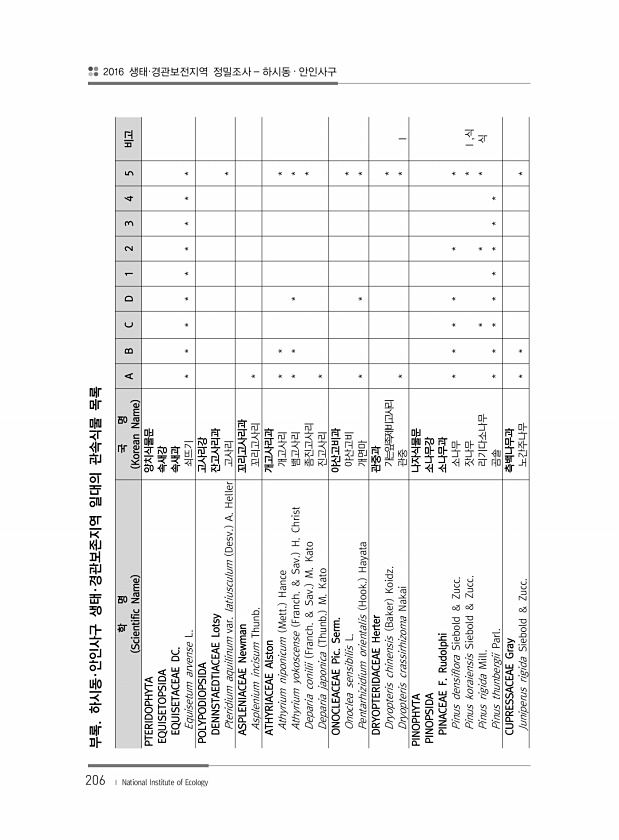 206 부록. 하시동·안인사구 생태·경관보존지역 일대의 관속식물 목록 학 명 Scientific Name 국 명 Korean Name A B C D 1 2 3 4 5 비고 PTERIDOPHYTA 양치식물문 EQUISETOPSIDA 속새강 EQUISETACEAE DC. 속새과 Equisetum arvense L. 쇠뜨기 * * * * * * * * * POLYPODIOPSIDA 고사리강 DENNSTAEDTIACEAE Lotsy 잔고사리과 Pteridium aquilinum var. latiusculum Desv. A. Heller 고사리 * ASPLENIACEAE Newman 꼬리고사리과 Asplenium incisum Thunb. 꼬리고사리 * ATHYRIACEAE Alston 개고사리과 Athyrium n...