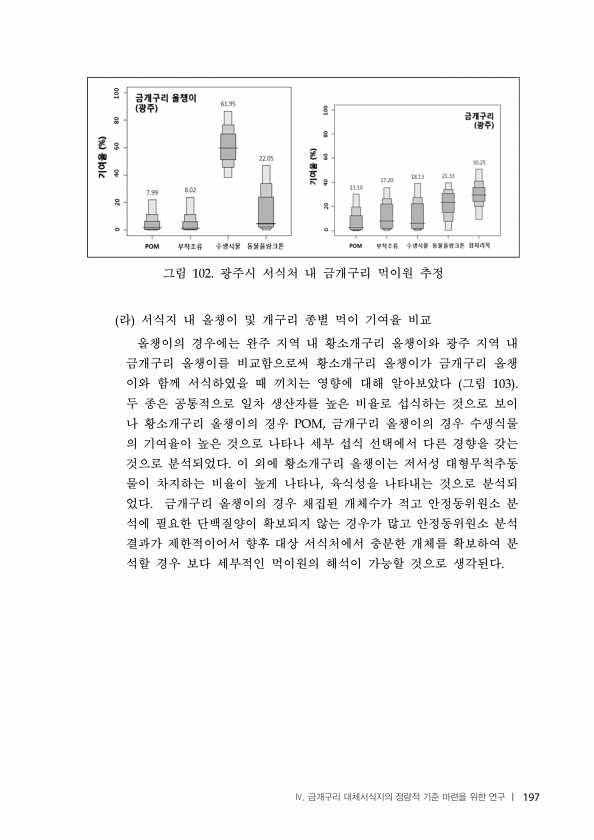 그림 광주시 서식처 내 금개구리 먹이원 추정 라 서식지 내 올챙이 및 개구리 종별 먹이 기여율 비교 올챙이의 경우에는 완주 지역 내 황소개구리 올챙이와 광주 지역 내 금개구리 올챙이를 비교함으로써 황소개구리 올챙이가 금개구리 올챙 이와 함께 서식하였을 때 끼치는 영향에 대해 알아보았다 그림 두 종은 공통적으로 일차 생산자를 높은 비율로 섭식하는 것으로 보이 나 황소개구리 올챙이의 경우 금개구리 올챙이의 경우 수생식물 의 기여율이 높은 것으로 나타나 세부 섭식 선택에서 다른 경향을 갖는 것으로 분석되었다 이 외에 황소개구리 올챙이는 저서성 대형무척추동 물이 차지하는 비율이 높게 나타나 육식성을 나타내는 것으로 분석되 었다 금개구리 올챙이의 경우 채집된 개체수가 적고 안정동위원소 분 석에 필요한 단백질양이 확보...