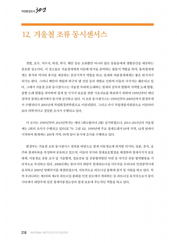 갯벌, 호수, 저수지, 하천, 하구, 해안 등은 조류뿐만 아니라 많은 동물들에게 생활공간을 제공하는 중요한 장소이다. 이 장소들은 겨울철새에게 이듬해 번식을 준비하는 월동지 역할을 하며, 통과철새에 게는 휴식과 먹이와 휴식을 제공하는 중간기착지 역할을 하고, 텃새와 여름철새에게는 좋은 번식지가 되기도 한다. 그러나 해안의 매립과 하구의 댐 건설 등의 개발로 인하여 이들의 서식지는 훼손되고 있 다. 그래서 겨울철 조류 동시센서스는 겨울철 국내에 도래하는 철새의 전국의 현황과 지역별 도래 현황, 종별 도래 현황을 파악하여 철새 및 서식지 보호를 위한 기초자료를 확보하기 위하여 1999년부터 매년 전국의 철새도래지에서 동시에 실시하고 있다. 이 조류 동시센서스는 1999년부터 2000년까지 환경부에 서 수행되다가...