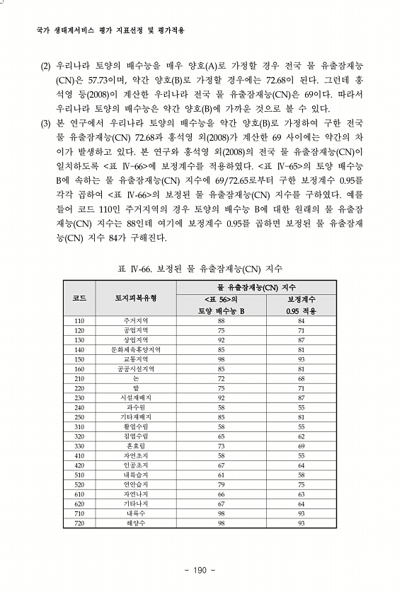 국가 생태계서비스 평가 지표선정 및 평가적용 190 2 우리나라 토양의 배수능을 매우 양호 A 로 가정할 경우 전국 물 유출잠재능 CN 은 57.73이며, 약간 양호 B 로 가정할 경우에는 72.68이 된다. 그런데 홍 석영 등 2008 이 계산한 우리나라 전국 물 유출잠재능 CN 은 69이다. 따라서 우리나라 토양의 배수능은 약간 양호 B 에 가까운 것으로 볼 수 있다. 3 본 연구에서 우리나라 토양의 배수능을 약간 양호 B 로 가정하여 구한 전국 물 유출잠재능 CN 72.68과 홍석영 외 2008 가 계산한 69 사이에는 약간의 차 이가 발생하고 있다. 본 연구와 홍석영 외 2008 의 전국 물 유출잠재능 CN 이 일치하도록 표 Ⅳ 66 에 보정계수를 적용하였다. 표 Ⅳ 65 의 토양 배수능 B에 속하는...
