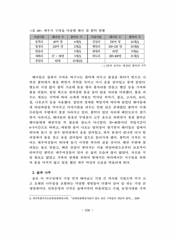 206 마을이름 해녀의 수 불턱의 수 마을이름 해녀의 수 불턱의 수 동복리 여 명 개 김녕리 여 명 개 월정리 여 명 개 행원리 명 개 한동리 개 평대리 명 개 세화리 명 개 하도리 명 개 종달리 명 개 표 제주시 구좌읍 마을별 해녀 및 불턱 현황 안의 숫자는 멸실된 불턱의 수 해녀들은 집에서 가져온 바구니는 불턱에 놔두고 물질을 하다가 밖으로 나 와선 불턱에서 불을 쬐면서 추위를 녹이고 다시 옷을 갈아입고 물에 들었다 별도의 시설 없이 불턱 가운데 돌을 쌓아 불자리를 만들고 땔감 등을 가져와 불을 피웠다 돌담 쪽으로 펑퍼짐한 돌을 놓아 앉을 자리를 마련했다 불을 피 우는 재료는 지역에 따라 소에게 여물로 먹이던 찌꺼기 잡초 고사리 보리 짚 나뭇조각 등을 사용했다 집안의 경제를 책임지며 바다에 들었던 해녀들...