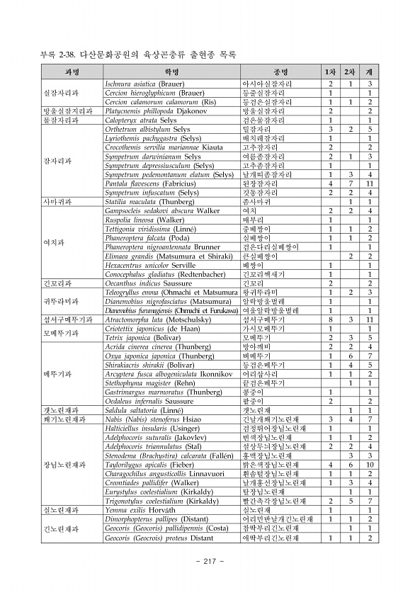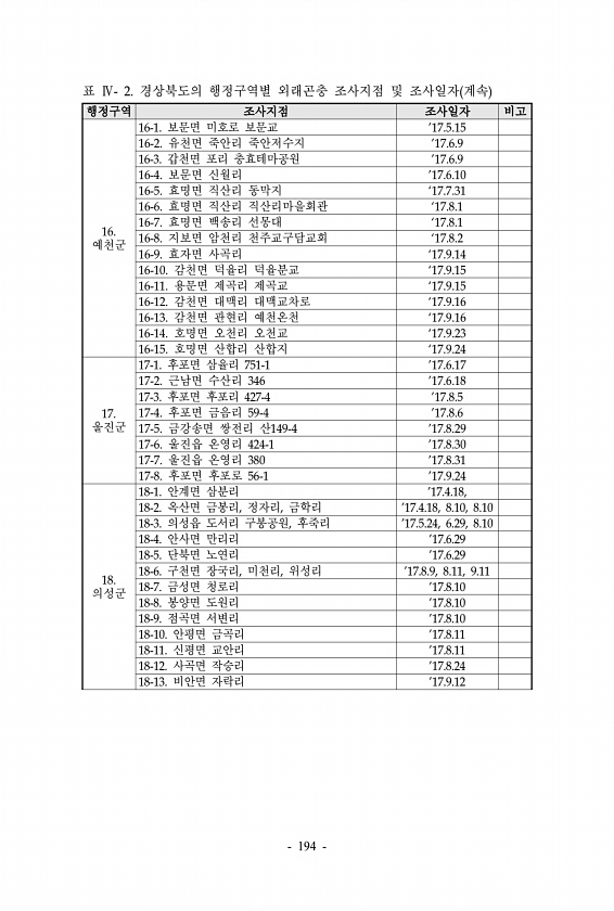 표 Ⅳ- 2. 경상북도의 행정구역별 외래곤충 조사지점 및 조사일자 계속 행정구역 조사지점 조사일자 비고 16. 예천군 16-1. 보문면 미호로 보문교 17.5.15 16-2. 유천면 죽안리 죽안저수지 17.6.9 16-3. 갑천면 포리 충효테마공원 17.6.9 16-4. 보문면 신월리 17.6.10 16-5. 효명면 직산리 동막지 ‘17.7.31 16-6. 효명면 직산리 직산리마을회관 ‘17.8.1 16-7. 효명면 백송리 선몽대 ‘17.8.1 16-8. 지보면 암천리 천주교구담교회 ‘17.8.2 16-9. 효자면 사곡리 ‘17.9.14 16-10. 감천면 덕율리 덕율분교 ‘17.9.15 16-11. 용문면 제곡리 제곡교 ‘17.9.15 16-12. 감천면 대맥리 대맥교차로 ‘17.9.16 16-13. 감천...