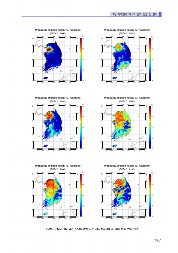 3장 기후변화 리스크 항목 선정 및 평가 197 그림 3.122 RCP4.5 시나리오에 따른 서양등골나물의 미래 분포 변화예측