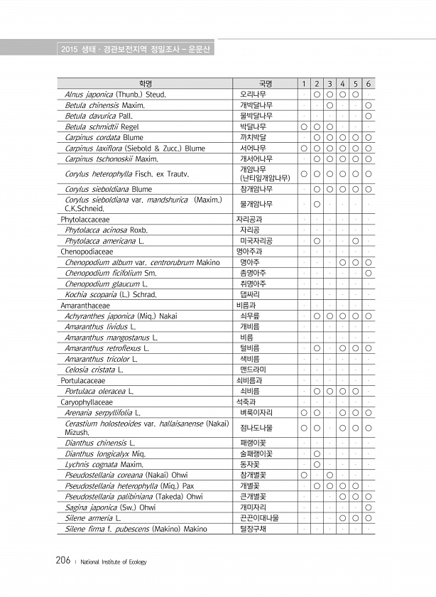 2015 생태·경관보전지역 정밀조사 운문산 206 ? National Institute of Ecology 학명 국명 1 2 3 4 5 6 Alnus japonica Thunb. Steud. 오리나무 ○ ○ ○ ○ Betula chinensis Maxim. 개박달나무 ○ ○ Betula davurica Pall. 물박달나무 ○ Betula schmidtii Regel 박달나무 ○ ○ ○ Carpinus cordata Blume 까치박달 ○ ○ ○ ○ ○ Carpinus laxiflora Siebold & Zucc. Blume 서어나무 ○ ○ ○ ○ ○ ○ Carpinus tschonoskii Maxim. 개서어나무 ○ ○ ○ ○ ○ Corylus he...
