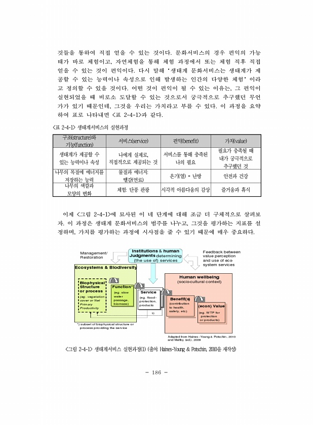 186 것들을 통하여 직접 얻을 수 있는 것이다. 문화서비스의 경우 편익의 가능 태가 바로 체험이고, 자연체험을 통해 체험 과정에서 또는 체험 직후 직접 얻을 수 있는 것이 편익이다. 다시 말해‘생태계 문화서비스는 생태계가 제 공할 수 있는 능력이나 속성으로 인해 발생하는 인간의 다양한 체험’이라 고 정의할 수 있을 것이다. 어떤 것이 편익이 될 수 있는 이유는, 그 편익이 실현되었을 때 비로소 도달할 수 있는 것으로서 궁극적으로 추구했던 무언 가가 있기 때문인데, 그것을 우리는 가치라고 부를 수 있다. 이 과정을 요약 하여 표로 나타내면 표 2-4-1 과 같다. 구조 structure 와 기능 function 서비스 service 편익 benefit 가치 value 생태계가 제공할 수 있는 능력이나 속성 ...