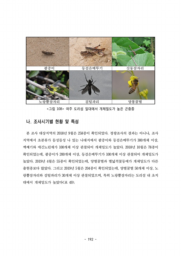 192 팥중이 등검은메뚜기 깃동잠자리 노랑뿔잠자리 검털파리 양봉꿀벌 그림 108 여주 도리섬 일대에서 개체밀도가 높은 곤충종 본 조사 대상지역의 년 월은 종이 확인되었다 정량조사의 결과는 아니나 조사 2018 9 258 , 지역에서 초본류가 듬성듬성 나 있는 나대지에서 팥중이와 등검은메뚜기가 개체 이상 300 , 쌕쌔기와 애긴노린재가 개체 이상 관찰되어 개체밀도가 높았다 년 월은 종이 100 2018 10 78 확인되었는데 팥중이가 개체 이상 등검은메뚜기가 개체 이상 관찰되어 개체밀도가 , 200 , 100 높았다 년 월은 종이 확인되었는데 양벌꿀벌과 별넓적꽃등에가 개체밀도가 다른 2019 4 55 , 출현종보다 많았다 그리고 년 월은 종이 확인되었는데 양벌꿀벌 개체 이상 노 2019 5 204 , 50 ,...