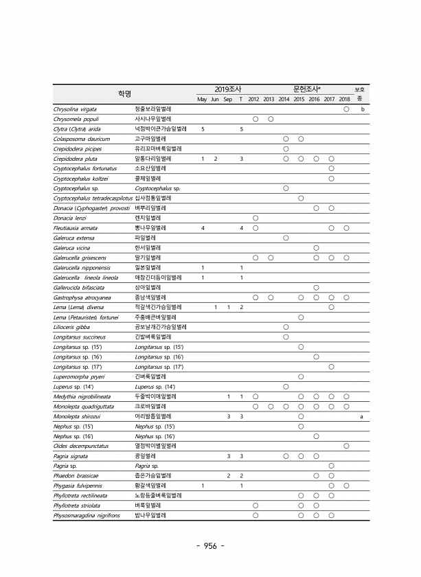 956 학명 2019조사 문헌조사* 보호 May Jun Sep T 2012 2013 2014 2015 2016 2017 2018 종 Chrysolina virgata 청줄보라잎벌레 ? b Chrysomela populi 사시나무잎벌레 ? ? Clytra Clytra arida 넉점박이큰가슴잎벌레 5 5 Colasposoma dauricum 고구마잎벌레 ? ? Crepidodera picipes 유리꼬마벼룩잎벌레 ? Crepidodera pluta 알통다리잎벌레 1 2 3 ? ? ? ? Cryptocephalus fortunatus 소요산잎벌레 ? Cryptocephalus koltzei 콜체잎벌레 ? Cryptocephalus sp. Cryptocephalus sp. ? Cryptocephalus tetra...