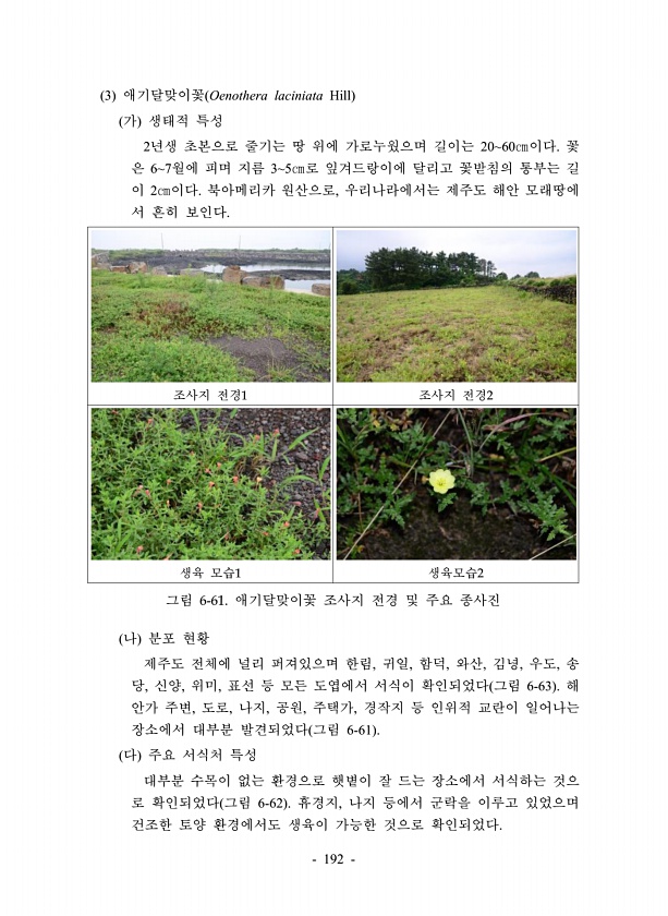 192 3 애기달맞이꽃 Oenothera laciniata Hill 가 생태적 특성 2년생 초본으로 줄기는 땅 위에 가로누웠으며 길이는 2060㎝이다. 꽃 은 67월에 피며 지름 35㎝로 잎겨드랑이에 달리고 꽃받침의 통부는 길 이 2㎝이다. 북아메리카 원산으로, 우리나라에서는 제주도 해안 모래땅에 서 흔히 보인다. 조사지 전경1 조사지 전경2 생육 모습1 생육모습2 그림 6-61. 애기달맞이꽃 조사지 전경 및 주요 종사진 나 분포 현황 제주도 전체에 널리 퍼져있으며 한림, 귀일, 함덕, 와산, 김녕, 우도, 송 당, 신양, 위미, 표선 등 모든 도엽에서 서식이 확인되었다 그림 6-63 해 안가 주변, 도로, 나지, 공원, 주택가, 경작지 등 인위적 교란이 일어나는 장소에서 대부분 발견되었다 그림 6-61 다...