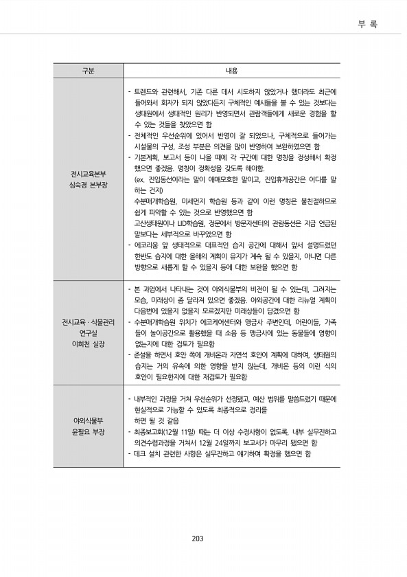 부 록 203 구분 내용 전시교육본부 심숙경 본부장 트렌드와 관련해서, 기존 다른 데서 시도하지 않았거나 했더라도 최근에 들어와서 회자가 되지 않았다든지 구체적인 예시들을 볼 수 있는 것보다는 생태원에서 생태적인 원리가 반영되면서 관람객들에게 새로운 경험을 할 수 있는 것들을 찾았으면 함 전체적인 우선순위에 있어서 반영이 잘 되었으나, 구체적으로 들어가는 시설물의 구성, 조성 부분은 의견을 많이 반영하여 보완하였으면 함 기본계획, 보고서 등이 나올 때에 각 구간에 대한 명칭을 정성해서 확정 했으면 좋겠음. 명칭이 정확성을 갖도록 해야함. ex. 진입동선이라는 말이 애매모호한 말이고, 진입휴게공간은 어디를 말 하는 건지 수분매개학습원, 미세먼지 학습원 등과 같이 이런 명칭은 불친절하므로 쉽게 파악할 수 있는 ...