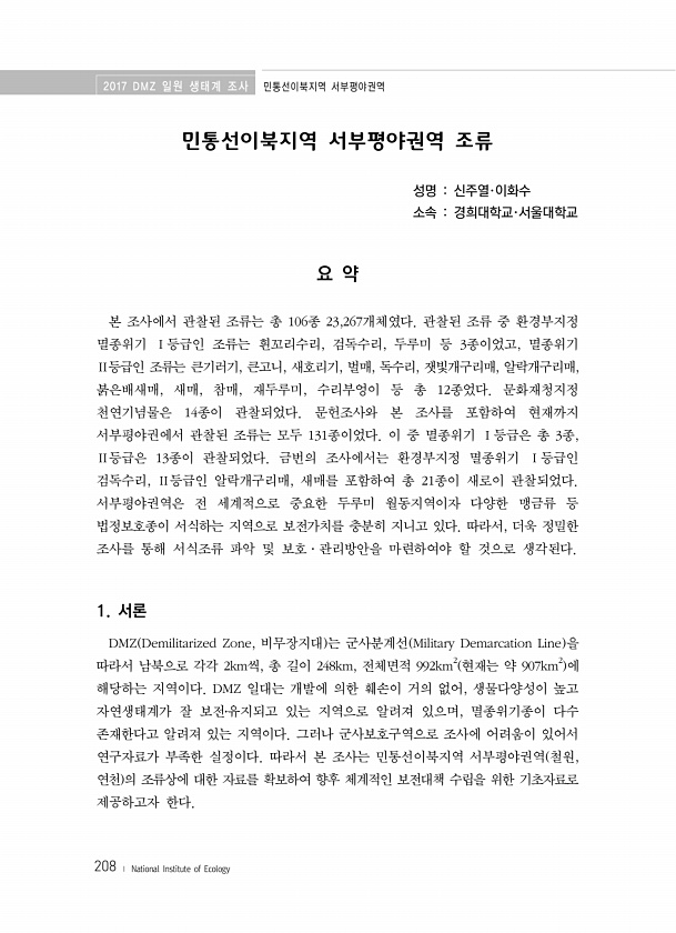 2017 DMZ 일원 생태계 조사 민통선이북지역 서부평야권역 208 ? National Institute of Ecology 민통선이북지역 서부평야권역 조류 성명 신주열·이화수 소속 경희대학교·서울대학교 요 약 본 조사에서 관찰된 조류는 총 106종 23,267개체였다. 관찰된 조류 중 환경부지정 멸종위기 Ⅰ등급인 조류는 흰꼬리수리, 검독수리, 두루미 등 3종이었고, 멸종위기 Ⅱ등급인 조류는 큰기러기, 큰고니, 새호리기, 벌매, 독수리, 잿빛개구리매, 알락개구리매, 붉은배새매, 새매, 참매, 재두루미, 수리부엉이 등 총 12종었다. 문화재청지정 천연기념물은 14종이 관찰되었다. 문헌조사와 본 조사를 포함하여 현재까지 서부평야권에서 관찰된 조류는 모두 131종이었다. 이 중 멸종위기 Ⅰ등급은 총 3종, Ⅱ등급...