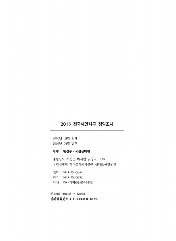 2015 전국해안사구 정밀조사 2016년 03월 인쇄 2016년 04월 발행 발행 환경부·국립생태원 충청남도 서천군 마서면 금강로 1210 국립생태원 생태조사평가본부 생태조사연구실 전화 041 950-5344 팩스 041 950-5952 인쇄 다나기획 02-859-5359 ⓒ2016 Printed in Korea 발간등록번호 11-1480000-001348-10
