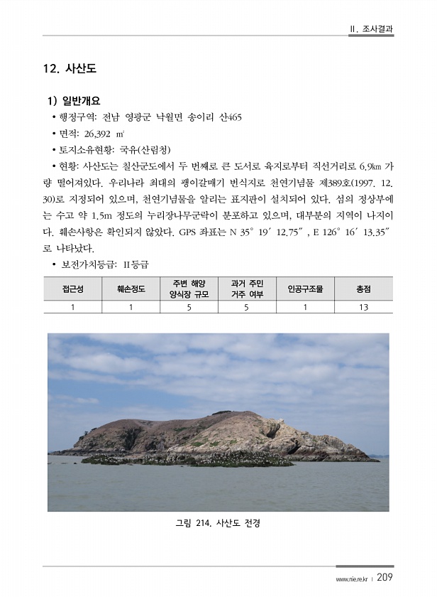 Ⅱ. 조사결과 www.nie.re.kr ? 209 12. 사산도 1 일반개요 ? 행정구역전남 영광군 낙월면 송이리 산465 ? 면적26,392 ㎡ ? 토지소유현황국유 산림청 ? 현황사산도는 칠산군도에서 두 번째로 큰 도서로 육지로부터 직선거리로 6.9㎞ 가 량 떨어져있다. 우리나라 최대의 괭이갈매기 번식지로 천연기념물 제389호 1997. 12. 30 로 지정되어 있으며, 천연기념물을 알리는 표지판이 설치되어 있다. 섬의 정상부에 는 수고 약 1.5m 정도의 누리장나무군락이 분포하고 있으며, 대부분의 지역이 나지이 다. 훼손사항은 확인되지 않았다. GPS 좌표는 N 35°19′12.75″, E 126°16′13.35″ 로 나타났다. ? 보전가치등급Ⅱ등급 접근성 훼손정도 주변 해양 양식장 규모 과거 주민 거주...